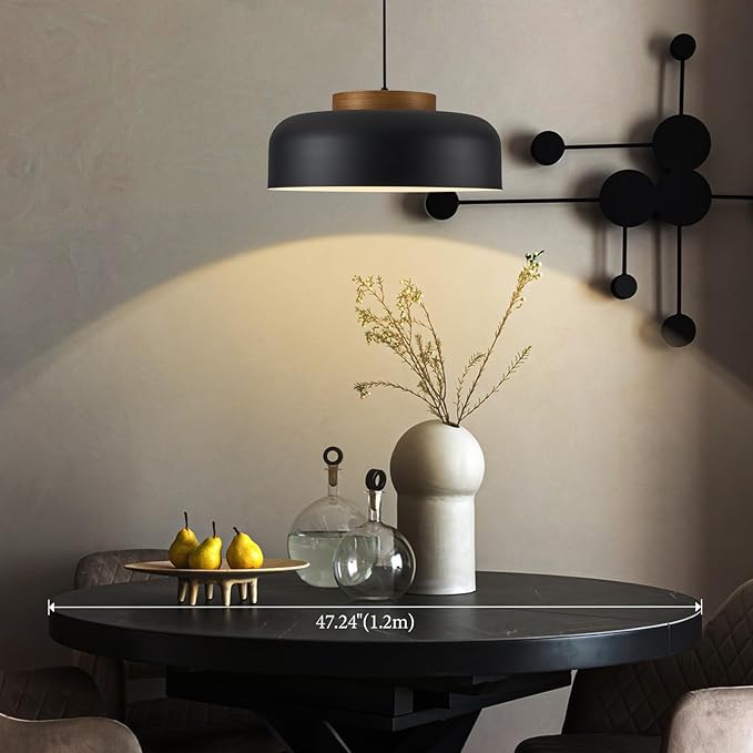 Modern Large Pendant Light Fixture, 17.7 inch,Natural Wood Cap, Matte Black Finish, Simple Pendant Lighting for Kitchen Island, Dining Room, Table