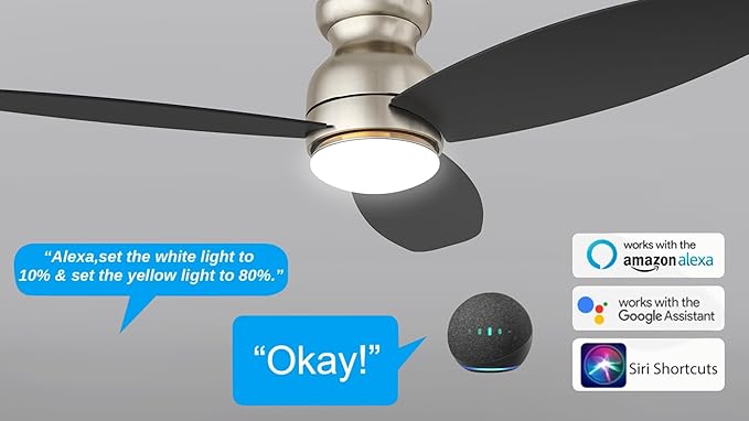 • 【5 Ways to Control】: This ceiling fan with lights and the remote controller, you will not lost control to the indoor and outdoor ceiling fan even when the WiFi signal lost ; Control you low profile ceiling fan and DIY the fan setting from any distance via the mobile phone app; Also, this smart ceiling fan can work with Alexa Siri &Google Assistant. "Alexa, set the black ceiling fan in bedroom to speed 6, set yellow light to 75%, set white light to 65%."