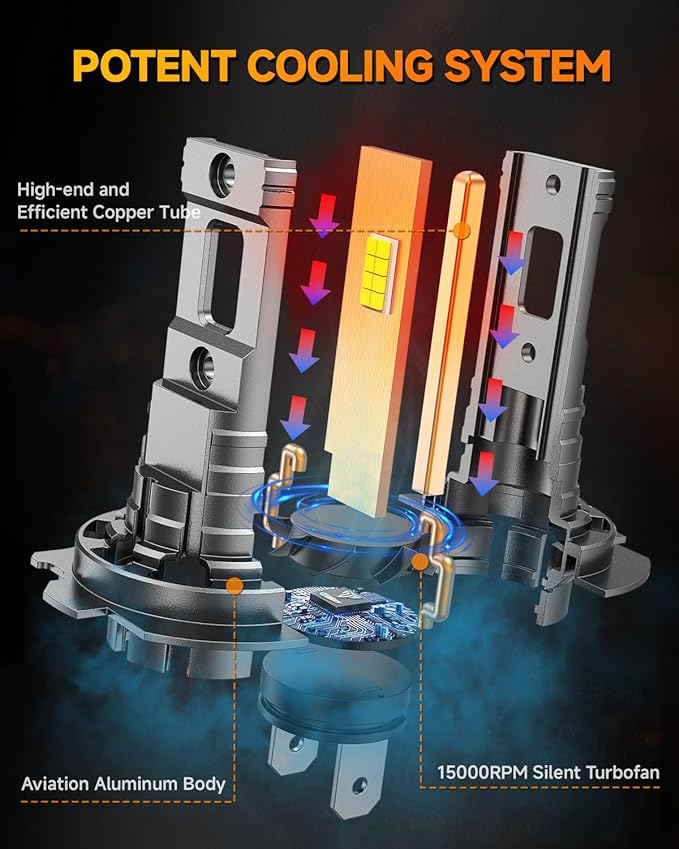 • Over 6,0000 Hours Lifespan:Built with premium materials like aviation aluminum and a large copper baseboard, this H7 Lighting bulb ensures over 60,000 hours of continuous and stable illumination. Thanks to a high-speed cooling fan,it efficiently dissipates heat,eliminating the need for frequent replacements.