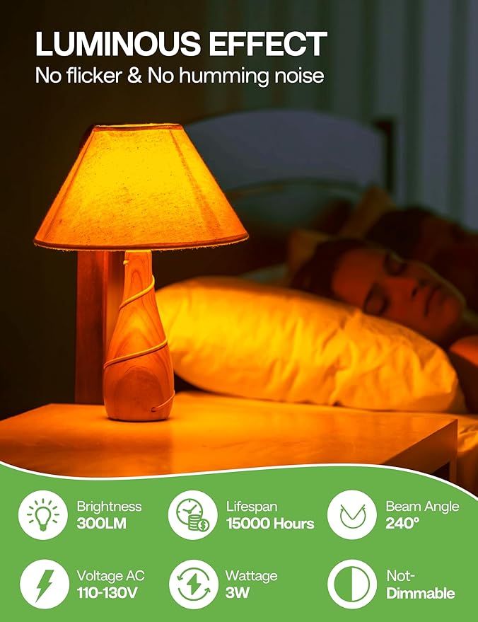 • Versatile Use: Our amber warm light bulb, designed with a standard E26 socket, fits seamlessly into most fixtures. It serves as an ideal choice for various settings, be it as a bedside lamp, a reading light, or general ambient lighting. It is particularly suitable for bedrooms, nurseries, or any area where tranquility is sought after