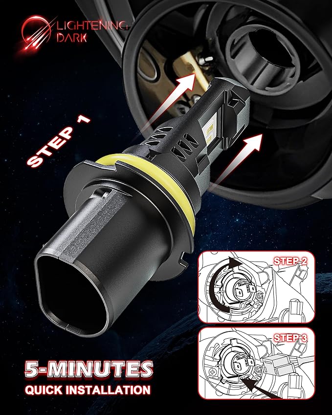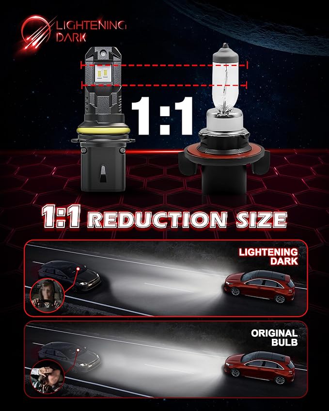 • 【1:1 Size】LIGHTENING DARK 9007 bulb 1:1 restores your original bulb size, exactly fit with the plug. Straight plug design, no extra wiring harness required, realizes 5 minutes fast installation