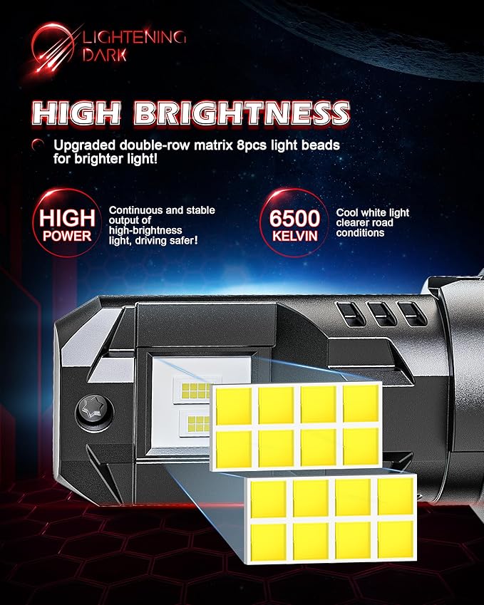 • 【400% Brightness】9007 light bulb adopts upgraded double rows of 8 lamp beads, 6500K xenon white light, expanding the visibility range to a large extent, to ensure the safety of driving