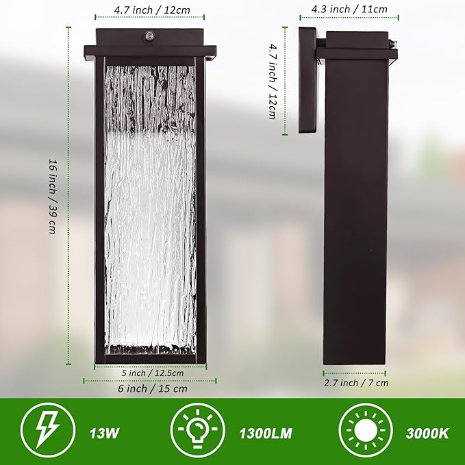 【Contemporary Aesthetics】This dusk to dawn outside wall lantern uses water ripple glass, which has the characteristics of light transmission and opacity, making the light soft and elevating your outdoor decor with beauty. The oil rubbed bronze exterior wall light isn't just about illumination; it's a stylish addition to your exterior spaces. The water-rippled glass design not only adds a touch of elegance but also disperses light evenly, ensuring clear visibility without harsh glare.