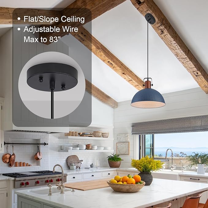 • [Industrial & Vintage Design]: 1-Light industrial farmhouse pendant light fixtures with adjustable cord,Hammered blue finish featuring retro-style dome shade, this antique pendant lighting is made of sturdy metal construction white inner finish.The vintage pendant lights is ideal for home, dining room, kitchen island, warehouse, entryway, corridor, restaurant, cafe, bar, club, barn, working bench.