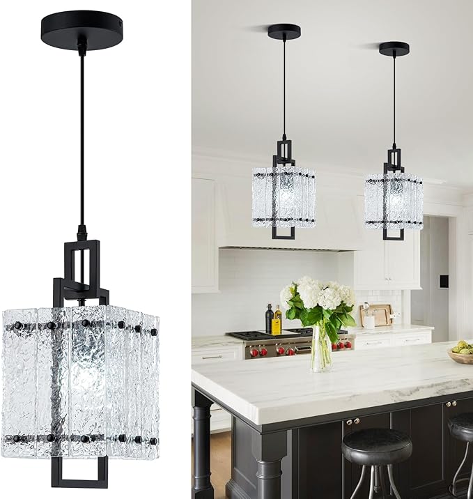 • Water Ripple Glass: This pendant light for the kitchen island features a water - ripple glass design and a matte - black - finished metal body, this combination creates a modern and charming aesthetic, Our black pendant light fixture can match most furniture styles, adding a touch of elegance to your home, when compared to those mini pendant lights, it is much more magnificent