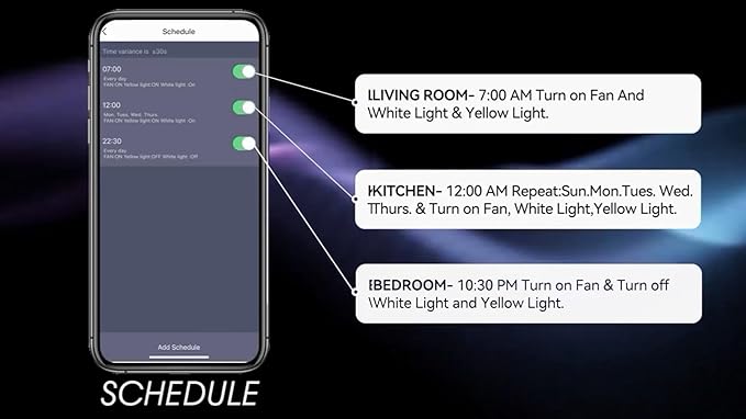 • 【Timers Function & Schedule Function】: With the schedule function, you can create a schedule for fans in different rooms. For example, “Smart ceiling fan with light in living room: Fan: on. Yellow light: on. White light: on. Time: 18:00. Repeat: Everyday. Notification: off.” ”white ceiling fan in study room: Fan: on. Yellow light: on. White light: off. Time: 21:00. Repeat: Mon-Fri. Note: Read Book. Notification: on.” You can automatically turn off after hours by the timer function.