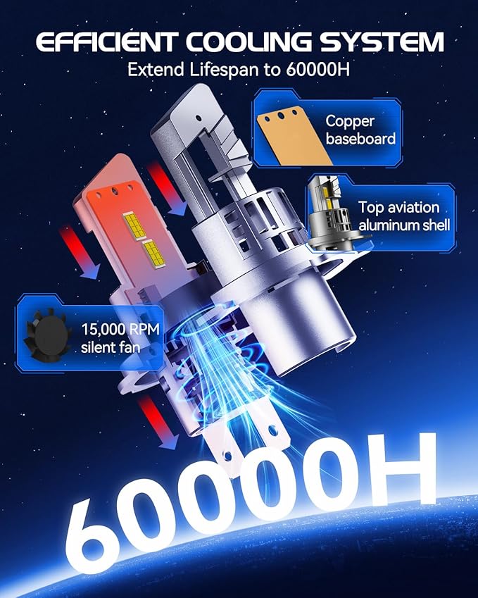 • 60,000 Hours Lifespan with Advanced Cooling: Equipped with a 15,000 RPM turbo-cooling fan and aviation-grade aluminum heat dissipation technology, these h4 bulbs maintain a stable temperature, ensuring a lifespan of up to 60,000 hours—10 times longer than traditional bulbs.