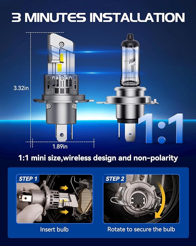 • Plug-N-Play Installation in 5 Minutes: Designed for hassle-free installation, the h4 Laxmas bulbs are true plug-and-play with no external drivers or modifications needed. The compact 1:1 size fits seamlessly into most vehicle housings