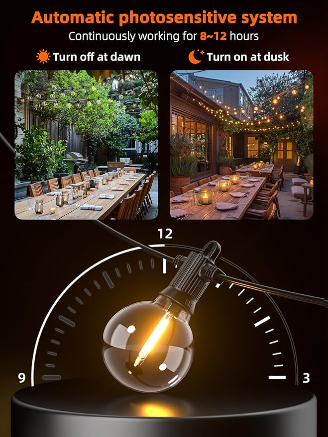 • DUSK TO DAWN LIGHTING: Kawaya patio lights solar powered come with a built-in light sensor that acts as your personal lighting assistant. It automatically detects the onset of dusk, turning the lights on to bathe your space in a comforting glow throughout the night. As dawn approaches, the solar patio lights seamlessly switch off, conserving energy and initiating the recharging process, ready to light up your nights again.