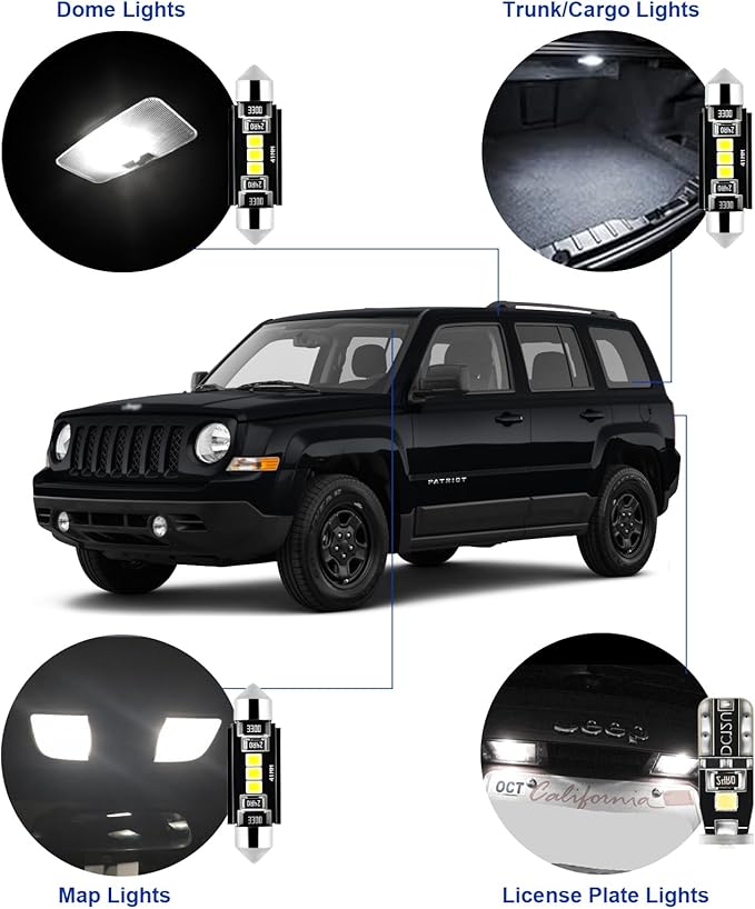 • Versatile Lighting for Interior & Exterior Use: This versatile LED Interior Lights kit is ideal for various uses inside your Patriot, including the dome light, map light, door lights, and footwell lighting. Enhance your Jeep Patriot's interior aesthetics or use them for practical purposes such as increased visibility when loading or unloading at night. These LED light also provide a modern, stylish look and are perfect for Patriot enthusiasts who want to customize their vehicle lighting.