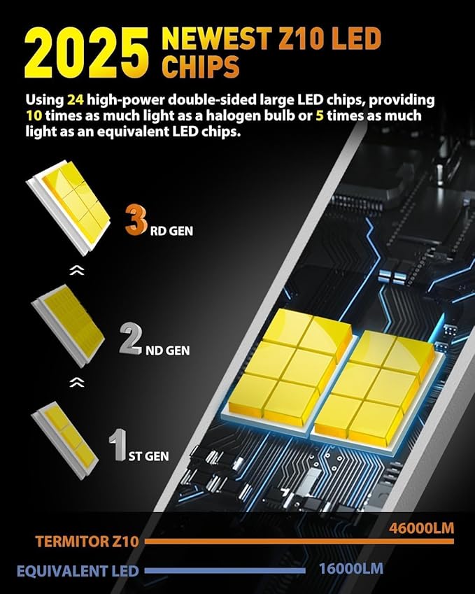 12X Brighter - Newly Enhanced: The Termitor H13 9008 LED Bulbs feature 24 high-performance chips, delivering up to 12 times the brightness of standard halogen bulbs. Upgrade your nighttime driving experience by replacing dim, yellow stock bulbs with Termitor H13 9008 light conversion kits, offering superior illumination and enhanced visibility with a crisp 6500K cool white light for optimal light transmission