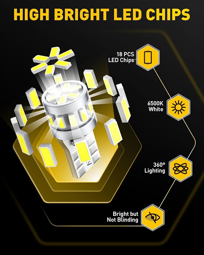 • 400% Brighter: AUXITO 194 led bulb uses 18pcs high performance LED chips, generating 6500K super bright output, 360 ° lighting, no dark spots. Bring bright light and new look to your car.