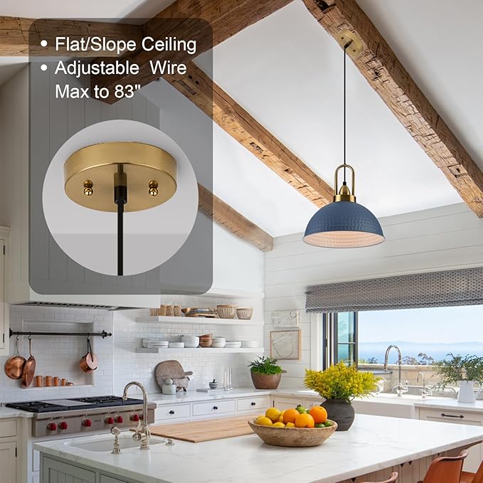 • [Industrial & Vintage Design]: 2-Light farmhouse pendant light fixtures with adjustable cord, Hammered blue finish featuring retro-style dome shade,this antique pendant lighting is made of sturdy metal construction in black finish and inner gold finish.The vintage pendant lights is ideal for home,dining room,kitchen island,warehouse,entryway,corridor,restaurant, cafe,bar,club,barn,working bench.