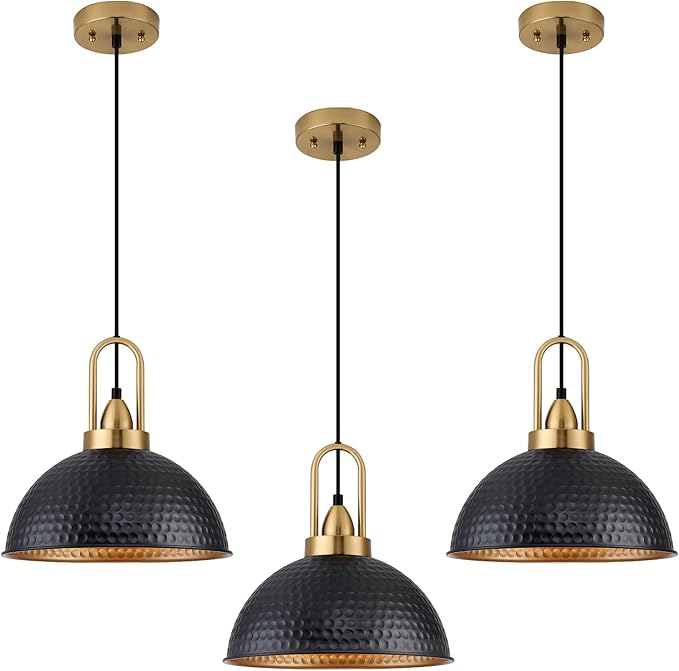 • [Industrial & Vintage Design]: 3-Light farmhouse pendant light fixtures with adjustable cord, Hammered mattle black finish featuring retro-style dome shade,this antique pendant lighting is made of sturdy metal construction in black finish and inner gold finish.The vintage pendant lights is ideal for home,dining room,kitchen island,warehouse,entryway,corridor,restaurant, cafe,bar,club,barn,working bench.