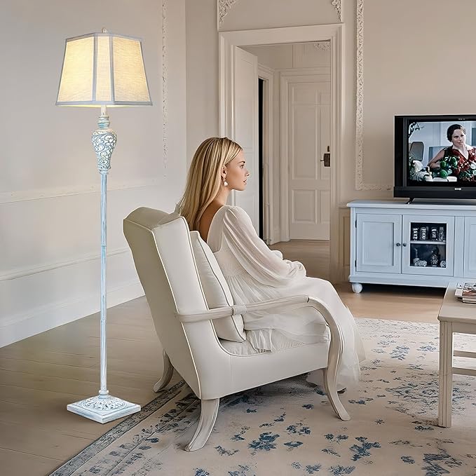 • UNIQUE DESIGNS: This farmhouse floor lamp combines vintage charm with luxurious style. Exquisite hollow carved leaves on the base and night light make it look elegant and beautiful. The lamp body is made of durable resin and metal with washed blue finish.