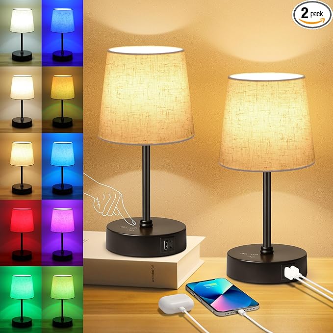Ascher Small Bedside Table lamp Set of 2, RGB Color Changing Lamps, 3 Color Temperatures, Dimmable Nightstand Lamp with USB C+A Ports, Touch Desk Lamp for Bedroom Living Room, H11.4in(Flaxen Shade)