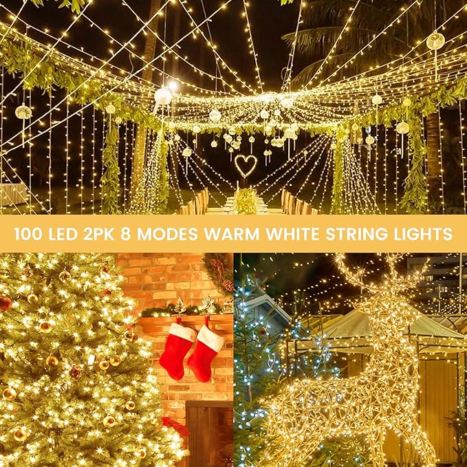 • Ultra-Bright and Durable Battery Powered String Lights: Each Christmas string light is 33 feet, features 100 super bright LEDs and a waterproof battery case with 8 lighting modes to ensure longevity and reliability. The warm white Christmas lights emit a classic, romantic and warm glow in the dark, making them an ideal choice for indoor and outdoor Christmas decorations. These fairy lights are perfect for Christmas, birthdays, parties, weddings, creating a cozy and joyful atmosphere.
