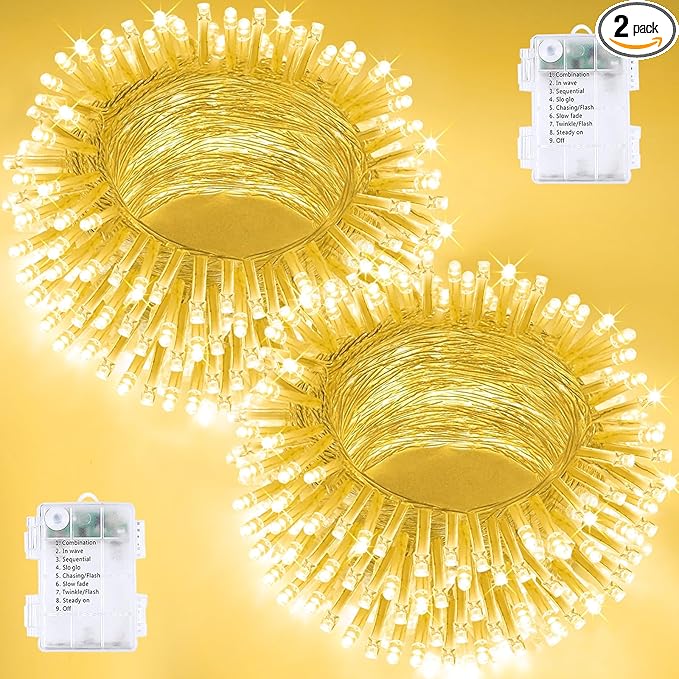 2 Pack Christmas String Lights Battery Operated with Timer, 66FT 200 LED Waterproof Twinkle Lights, 8 Modes Fairy Light for Indoor and Outdoor Bedroom Garland Tree Christmas Decorations (Warm White)