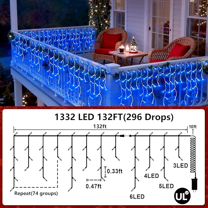 1332 LED 132ft Christmas String Lights Outdoor, 12 Modes Dimmable Curtain Lights with 296 Drops, Waterproof Fairy Lights with Timer for Bedroom Window Holiday Wedding Home Xmas Decorations, Blue