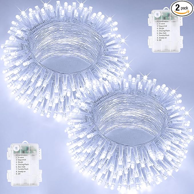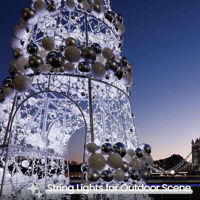 • Ultra-Bright and Durable Battery Powered String Lights: Each Christmas string light is 33 feet, features 100 super bright LEDs and a waterproof battery case with 8 lighting modes to ensure longevity and reliability. The cool white Christmas lights emit a bright, modern glow in the dark, making them an ideal choice for indoor and outdoor Christmas decorations. These fairy lights are perfect for Christmas, birthdays, parties, weddings, creating a cozy and joyful atmosphere.
