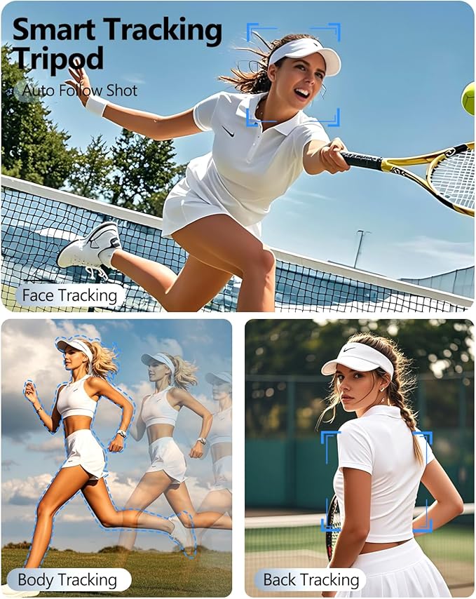 • 【360° AI Face Tracking – Smart Auto Framing】Equipped with AI-powered motion tracking, this tripod automatically detects and follows your face or body as you move—no app required. Its 360° rotation ensures you're always perfectly centered, ideal for live streams, video calls, and content creation.