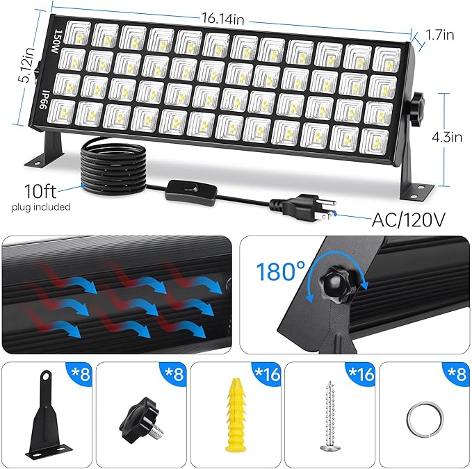 • Upgraded 16.1 Inches Enhanced Lighting Coverage: With a length of 16.1 inches, the outdoor shop light is longer than traditional floodlights, providing a wider lighting range. Equipped with high-quality reflective film and a 120° beam angle, ensures no dark spots, ghosting, or glare, effectively illuminating your entire space