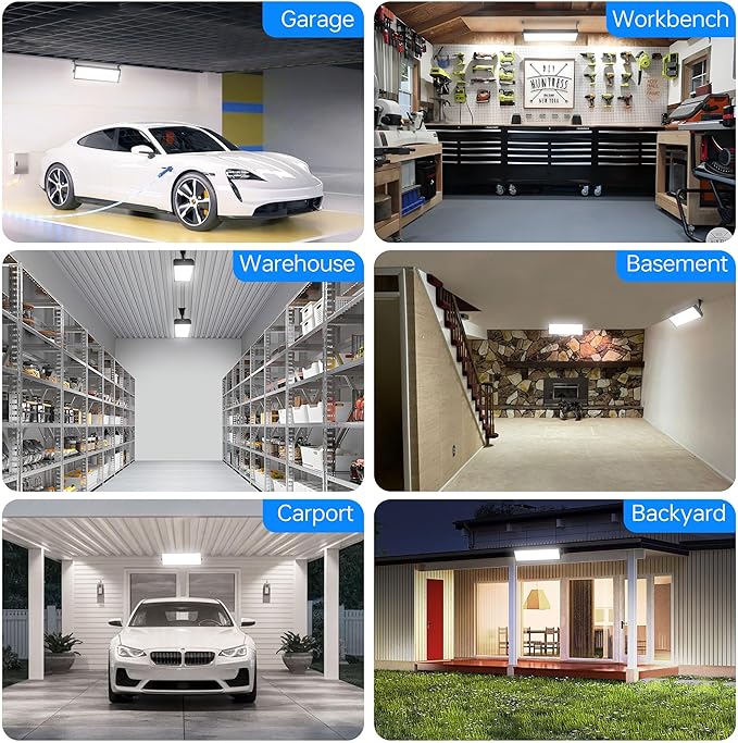 • Plug And Play: Plug in LED shop lights is easy to install and operate, with and an extra-long 3 m/10 ft power cord, simply plug it into a power outlet without complicated wiring. The light comes with a 180° adjustable bracket for effortless installation on ceilings, walls, floors, and more. (each garage light comes with 2 brackets + 4 screws + 4 expansion tube kits)