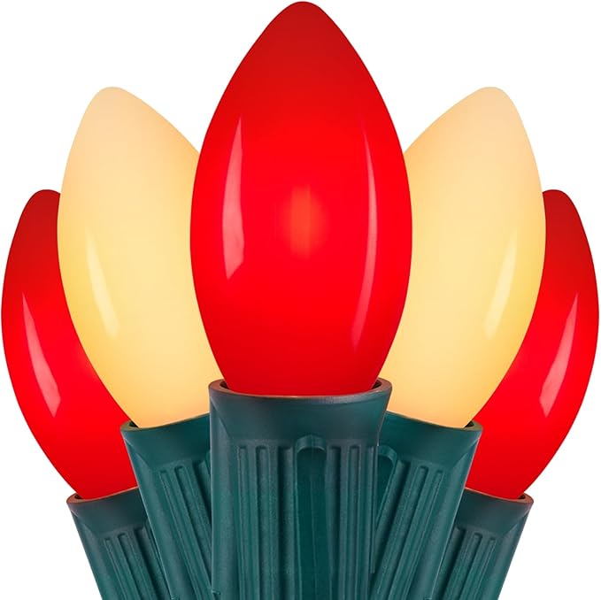 • Extra-Long 100Ft C9 Christmas Lights Outdoor: With a total length of 100 feet and 50 LED shatterproof frosted red and warm white bulbs, these green wire outdoor C9 string lights illuminate larger spaces, creating a rich festive atmosphere