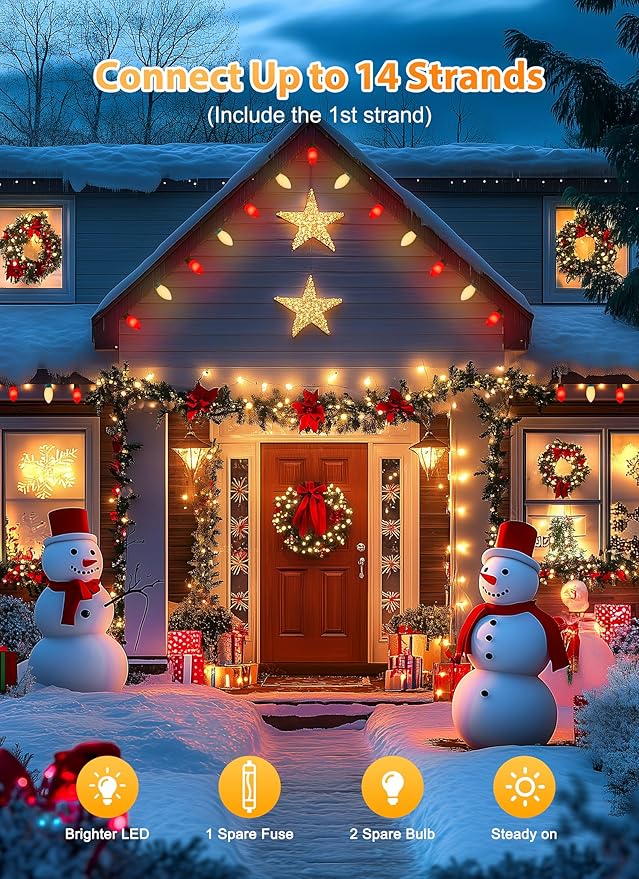 • Easy to Use and Connectable: Simple to install, with removable bulbs, these outdoor Christmas lights are plug-and-play. Each outdoor Christmas lights for house can be connected to up to 13 additional sets, making them perfect not only for Halloween, Thanksgiving, Xmas, and New Year’s decorations but also for weddings, parties, camping, family gatherings, living rooms, and café settings, effortlessly creating the desired ambiance