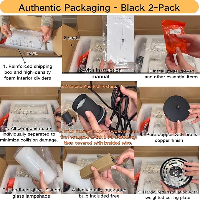 • 【Featured Design】This pendant lights kitchen island features a thickened HD clear glass shade, finely crafted diamond knurled texture and excellent heat dissipation copper base with thick and durable 72-inch adjustable braided rope, the ceiling tray is compatible with all kinds of ceilings, which makes the beautiful and classic pendant light hanging from the ceiling safer and more stable.