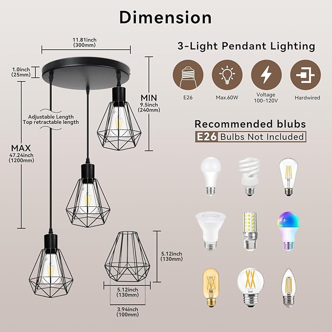 • 【3-Light Pendant Light Fixture with E26 Base】This hanging pendant light fixture requires 3xE26 base bulbs, (Max 60W for each light, Bulbs not included). You can update the bulbs to enjoy the atmosphere its lighting and flair exudes. When the dimmer switch is connected and the dimmer bulb is used, it can be fully dimmable. It's also up to you whether you want a dimming function, as this dining room pendant light fixtures work well with most dimmers in the US