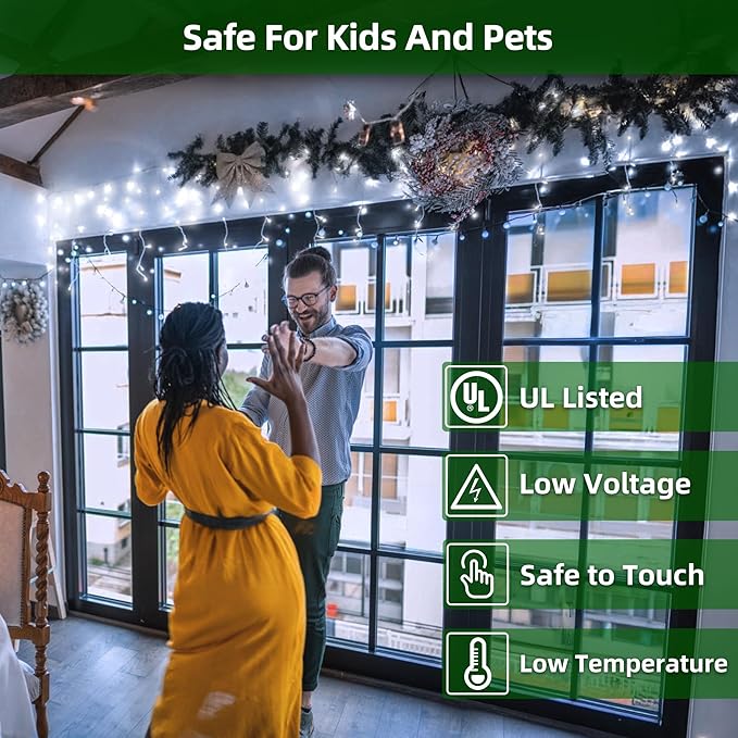 • Transform your home into a holiday haven: Our 164ft 1620 LED cool white icicle Christmas lights (360 drops) cover every corner—outdoor (roofs, patios, fences, gutters) to indoor (bedrooms, porches, balconies). The crisp cool white glow feels like winter frost, perfect for family time by the Christmas tree, cozy patio dinners, or sparkling gazebos and deck railings. Longer than most sets, it delivers a commercial Christmas lights look that keeps your holiday moments shining bright