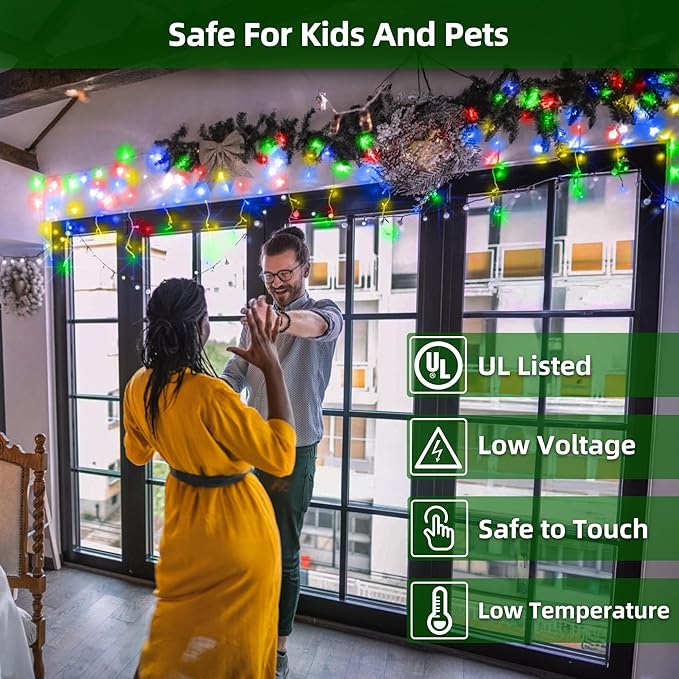 • Safe & energy efficient: Our UL-listed energy efficient Christmas lights use a 29V low-voltage plug, safe for kids and pets even after hours. LEDs consume 90% less power than incandescents and last up to 50,000 hours. Durable insulated wiring and sealed bulbs resist wear and weather, staying cool to the touch— just years of colorful glow. Suitable for both indoor and outdoor use, from Christmas tree lights to patio string lights.