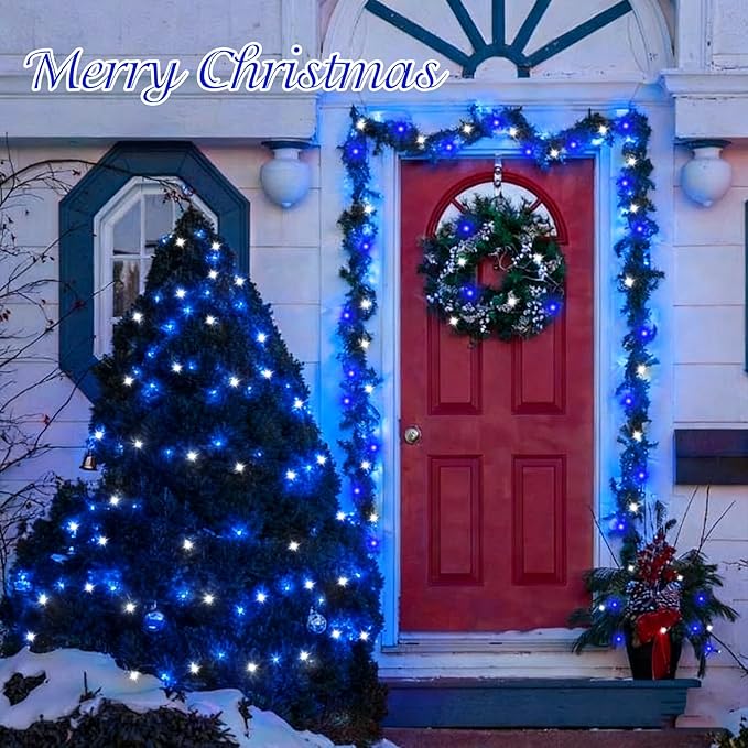 • 8 Modes Blue and White string lights:String lights outdoor waterproof have 8 different settings(in wavelike, combined, fading gradually, firefly-like, chasing, flashing, slowly fading, and continuous illumination), which can create a dreamy atmosphere. When night falls, different modes of lights will appear one after another, creating a unique Christmas experience just for you
