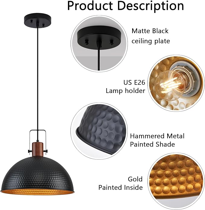 • [Industrial & Vintage Design]: 1-Light industrial farmhouse pendant light fixtures with adjustable cord,Hammered black finish retro-style dome shade, this antique pendant lighting is made of sturdy metal construction white inner finish.The vintage pendant lights is ideal for home, dining room, kitchen island, warehouse, entryway, corridor, restaurant, cafe, bar, club, barn, working bench.
