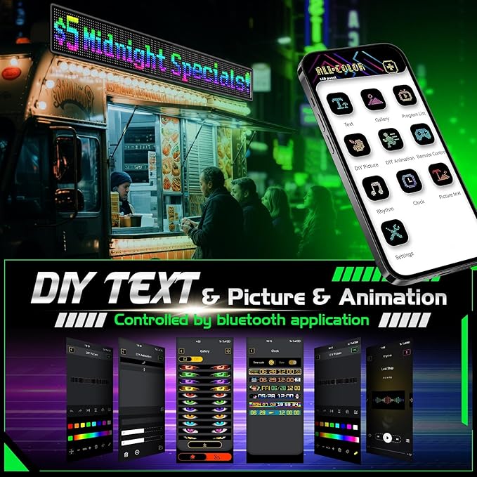 • MULTI OCCASION USE: You can set a 6-digit password for your programmable led sign to protect privacy, or share your DIY effects with other users. It can be applied to car windows, truck windows, motorcycle windows, semi truck windows,food truck sign, beverage truck sign, idol support, concerts, bars, shops, Christmas, Halloween, birthday parties, holiday gatherings, or wedding decorations.