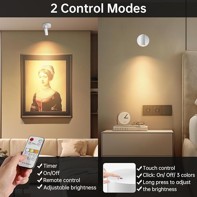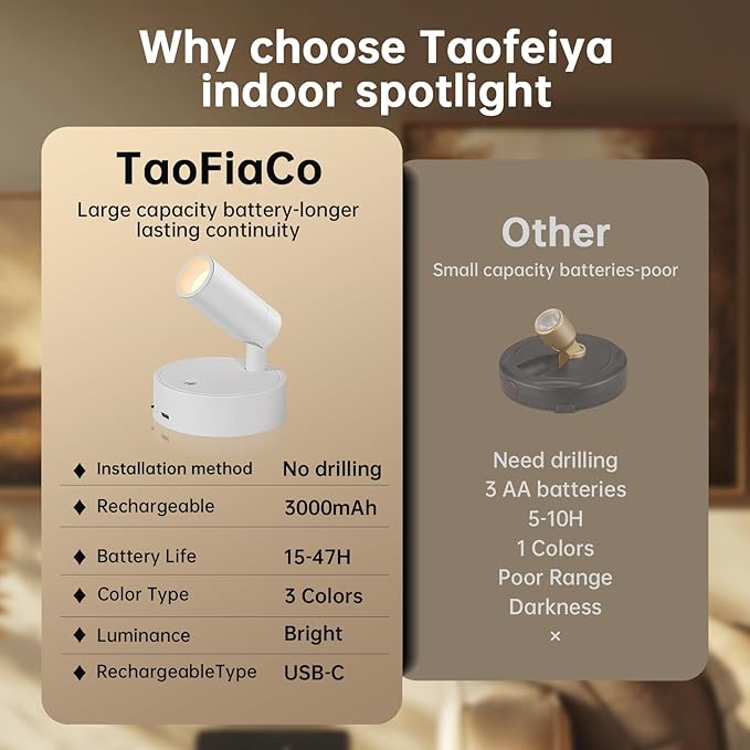 • Wireless & Rechargeable: This spot lights indoor has a built-in 3000mAh rechargeable battery, no wiring or plugs are required, safe and long-lasting lighting. The charging time is 4-5 hours, and it can be used for up to 15 hours at maximum brightness, up to 47 hours at low brightness