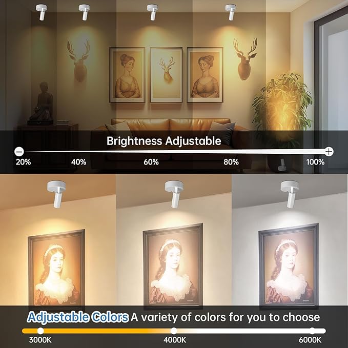 • Color Temperature & Dimming: The led spotlight indoor has three color temperature modes for you to choose from: 3000K warm light, 4000K natural light and 6000K cold light. In addition, the brightness can be adjusted between 10% and 100%, allowing you to easily choose the appropriate color temperature and brightness for lighting according to your mood