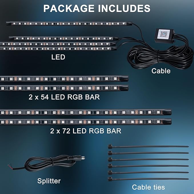 • Complete Kit for Instant Customization:"Includes 4PCS LED strips, power cables. Compatible with Ford, Dodge, Toyota, and most undercarriage lighting setups."
