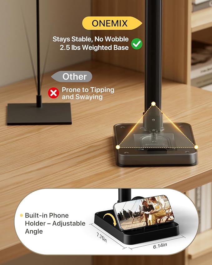 • Adjustable Arm & Sturdy Weighted Base: The 27.7-inch support arm is made of high-quality ABS plastic, with the upper gooseneck section allowing smooth 180° front-and-back bending for precise positioning. The aluminum alloy base features a 2.5 lb weighted insert for rock-solid stability with no wobble or tipping. It also includes a built-in phone holder for hands-free viewing—perfect for desks, countertops, or creative workspaces.