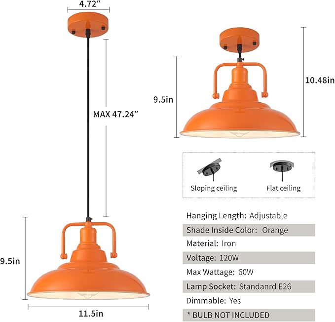 Reliable quality:The orange flush mount kitchen pendant lights are made of high-quality steel, while the outer surface has a orange spray paint, greatly increasing his durability, while the inner surface is white-colored spray paint, with a maximum power of 60w bulbs, can mention enough lighting