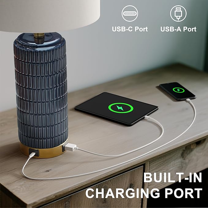 • Touch Control Blue Lamps: This touch lamps is equipped with a touch sensor, enabling quick adjustments to 3 distinct brightness levels (Low, Medium, High). Just a gentle touch or pat on the gold base of the touch bedside lamps for nightstands when you wish to turn the dimmable lamps with usb port on/off or make it brighter/dimmer.