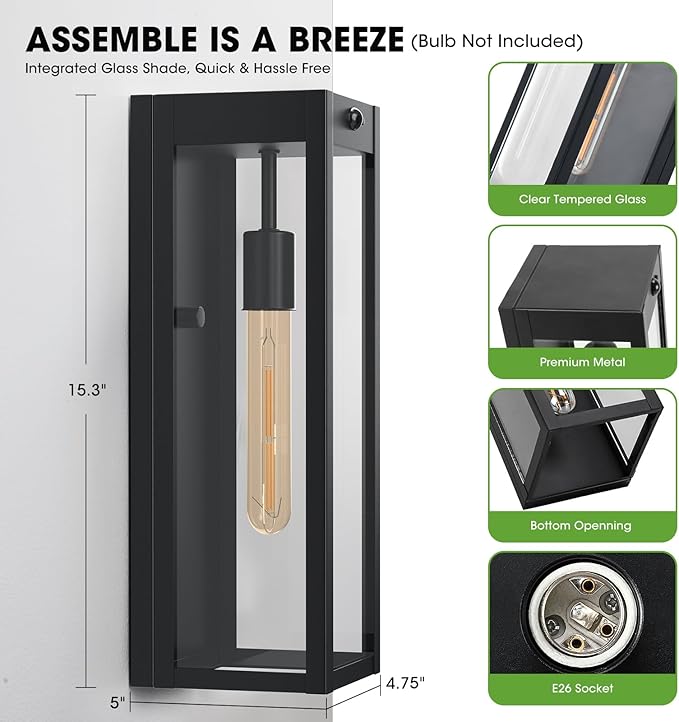 • [ Pre-aeesmbly Design for Easy Installation ] - These black exterior lighting are the integrated style that require no assembly and is easy to install. The glass shade has been pre-installed, just connect the wires and use two screws to fix the wall lamp on the wall. The uncover-bottom design of these exterior wall sconces make it extremely simple for you to replace the bulbs from the bottom without any tools or stripping it down.The package contains porch lights, mounting hardwares and instruction manual.