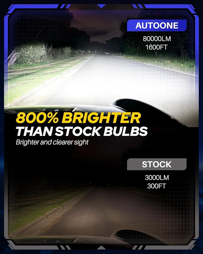 • 【800% Brightness Upgrade】 Equipped with top automotive-grade chips, bulbs deliver an impressive 800% per pair at a cool 6500K. The super-focused pattern ensures a wider and longer lighting range, making the h119005 bulb 8 times brighter than bulbs