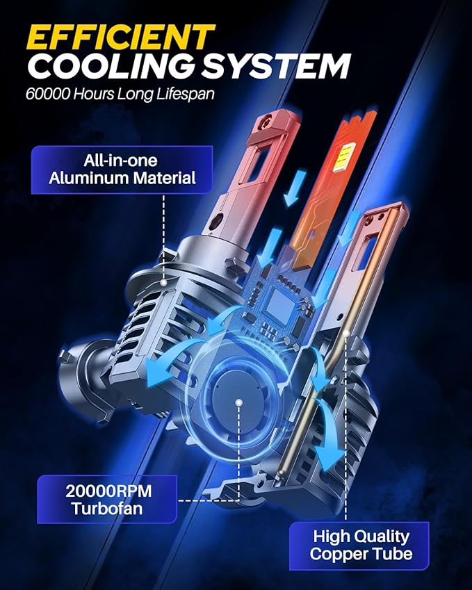• 【Over 60,000 Hours Lifespan】Constructed with aviation-grade aluminum and featuring an advanced cooling system with a hollow-carved heat sink and silent turbofan, these bulbs are built for longevity. They boast a lifespan exceeding 60,000 hours, providing reliable performance for years