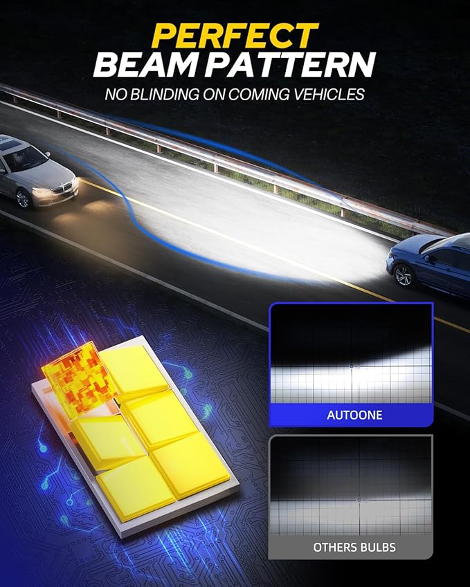 • 【Perfect Beam Pattern】 Perfectly simulate the pattern of original halogen bulbs. With ultra-thin chip spacing and 1:1 beam pattern technology, these bulbs deliver a focused beam for wider, longer-range illumination without dark spots or shadows, reducing glare for oncoming drivers