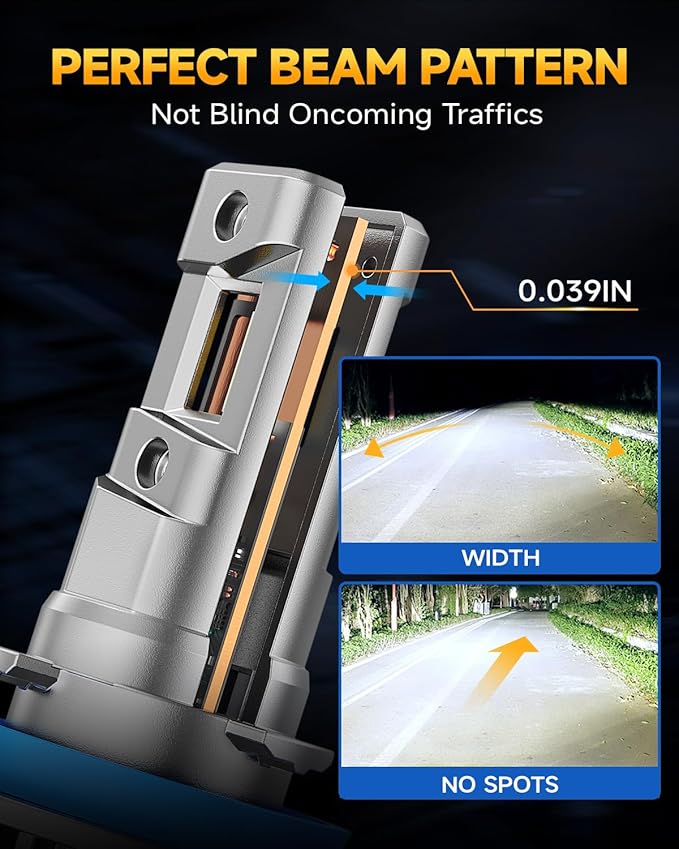 • 【Optimized Light with Exclusive Control Technology】Ursprung 9005/HB3 and H11/H8/H9 bulbs adopt an ultra-slim 0.03-inch structure with accurately positioned light chips to deliver a concentrated and extended beam pattern. This advanced layout removes shadow zones and prevents glare, offering a clearer view of the road ahead. The enhanced optical focus ensures broader illumination and improved safety in both city and highway driving scenarios.