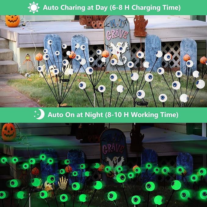 • Perfect for Halloween Decor and Gifting: Featuring unique, vibrant colors and horror-inspired elements, these solar eyeball lights are perfect for Halloween-themed graveyard, walkways, and ghost decorations. They also make excellent gifts for Halloween enthusiasts who appreciate spooky celebrations
