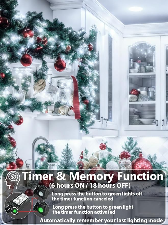• Unique 8 Lighting Modes & Timer & Memory Funtion: This twinkle lights have 8 modes to fit different occasions, moods, holidays, festivals, anniversaries, etc. Adjust the lighting modes by pressing the round button on the adapter. With built-in timer IC, long press the button of the adaptor to green, the timer function acitivated and it will be on for 6 hours and off for 18 hours repeatedly everday. The Xmas lights also have memory function, will remember your last lighting mode, free your hands from pressing the button everyday