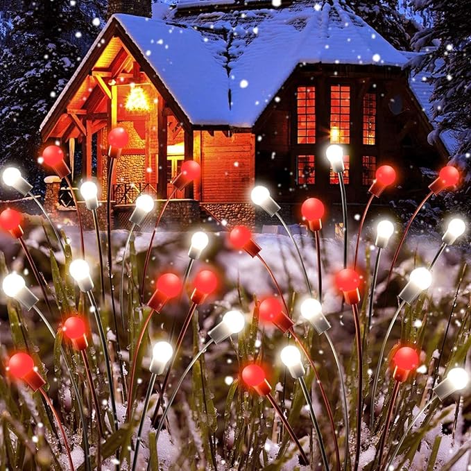 • [SWAYING BY WIND]: Solar Christmas lights swaying by the wind, as if fireflies flying in the yard; The branches are soft and flexible, and the unique design structure allows it to sway with the wind. The combination of red and white can emit warm and romantic lighting, creating a joyful atmosphere and fun at Christmas decorations parties.